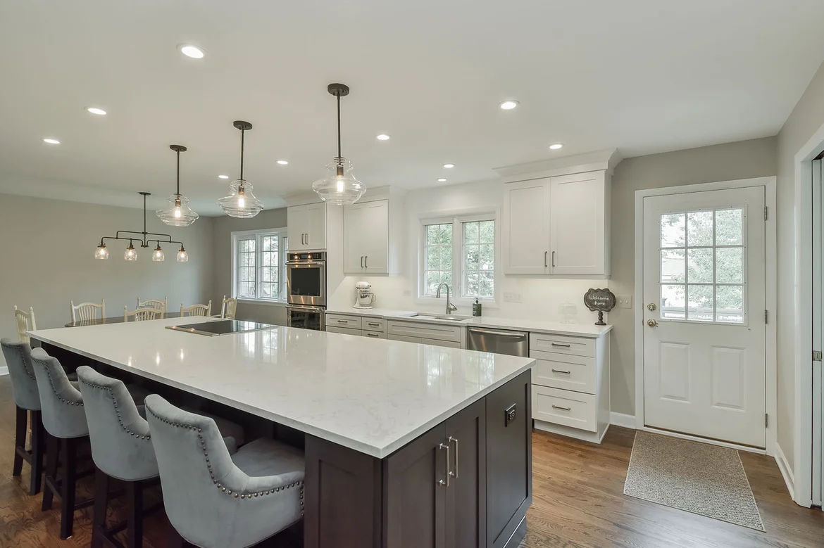 Built a massive multi-seat island with a dark espresso base and white quartz top.