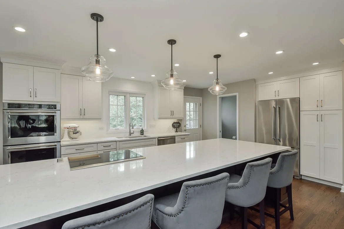 Added modern clear glass pendant lights over the island for soft, elegant illumination.