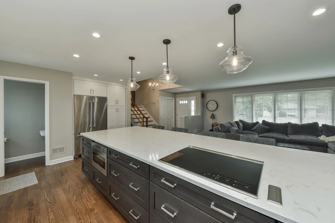 Removed dividing walls to create a seamless open-concept flow between the kitchen, dining room, and living room.