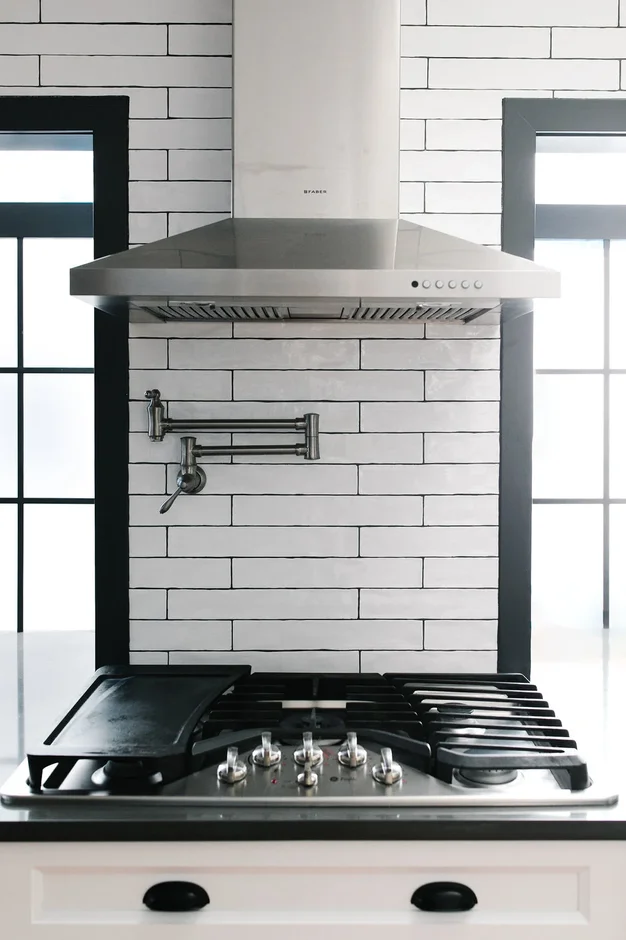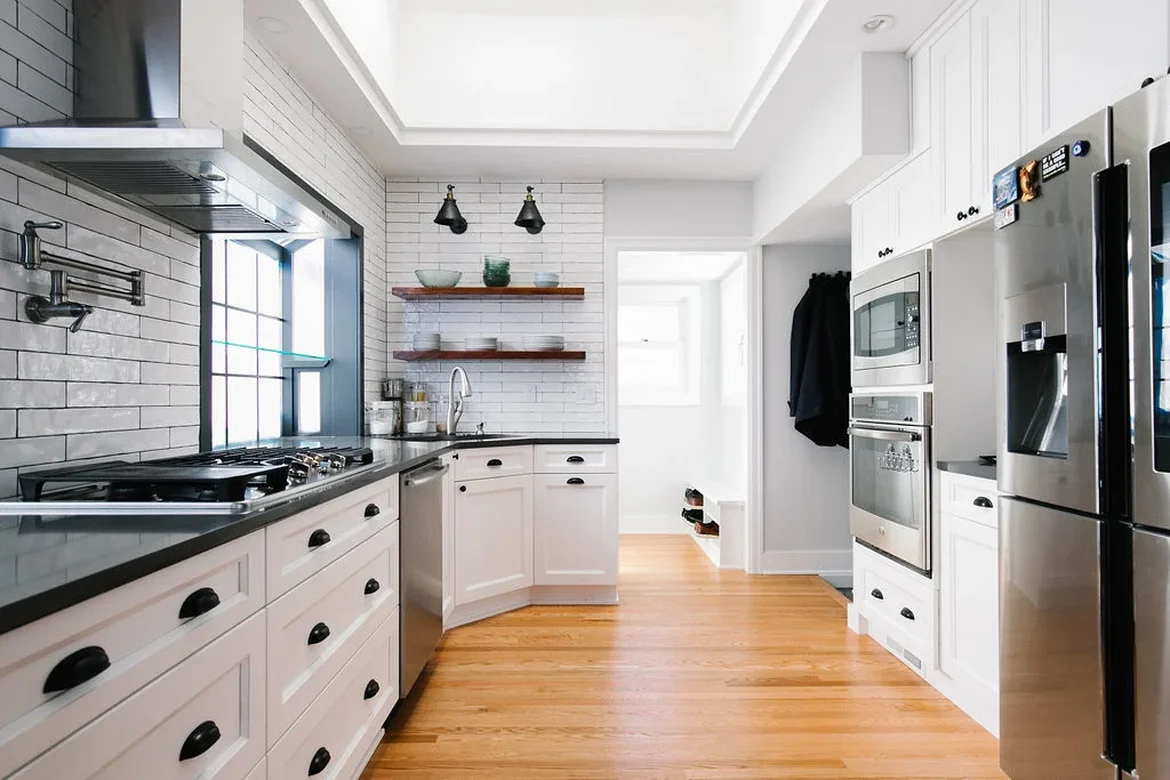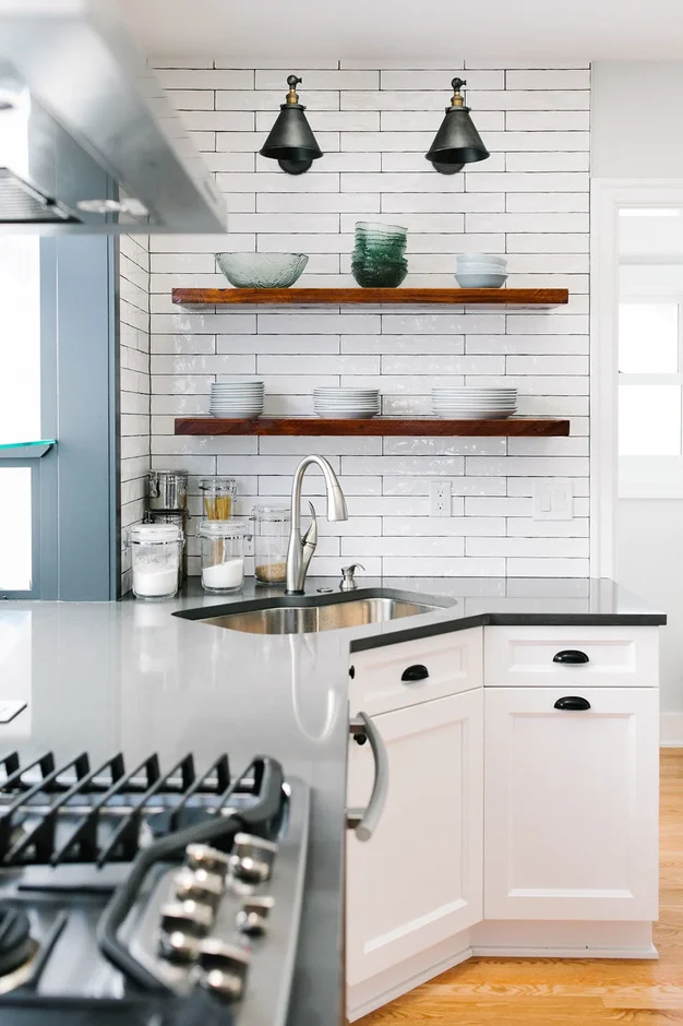 The kitchen walls were retiled with high-quality white subway tiles, providing a clean, timeless aesthetic. The updated tile backsplash creates a modern focal point and complements the new cabinetry. A floating wooden shelf was added for both functionality and visual appeal.