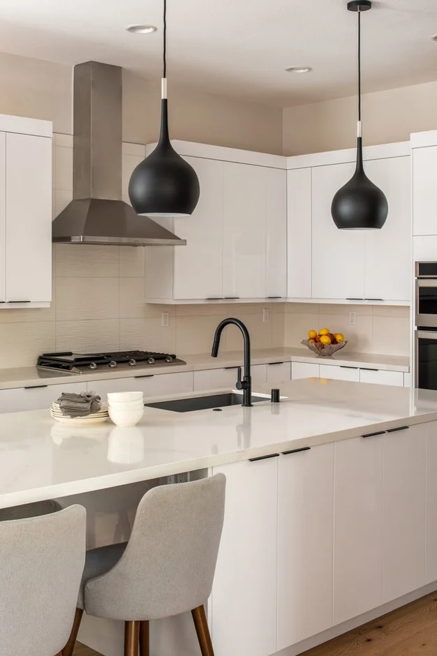 Electrical systems were updated to support modern kitchen needs. New recessed ceiling lights were installed throughout the space, along with contemporary black pendant lights above the island to provide focused task lighting and visual contrast.