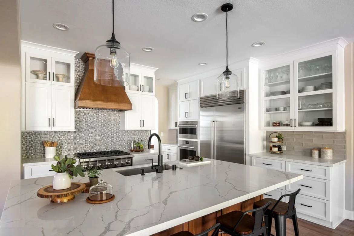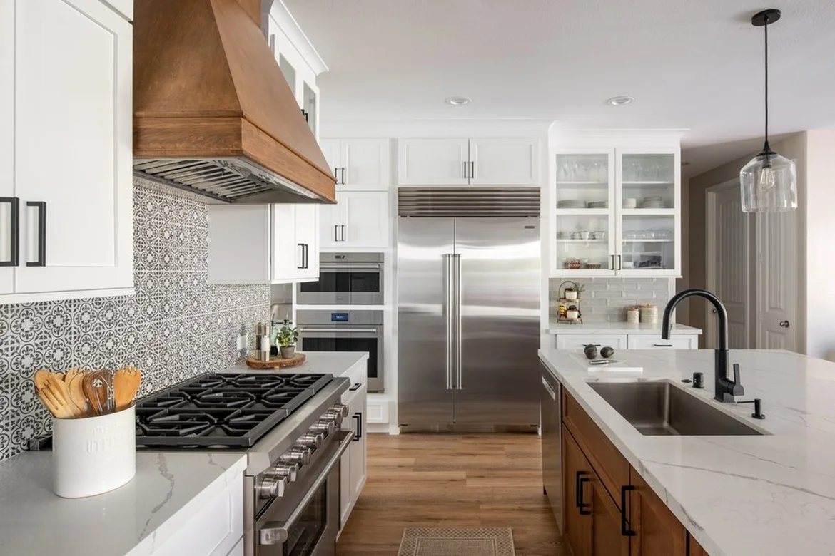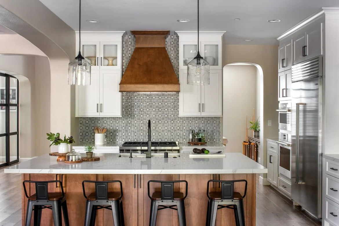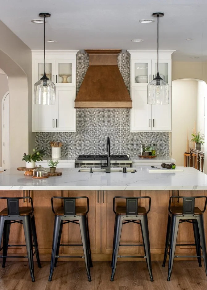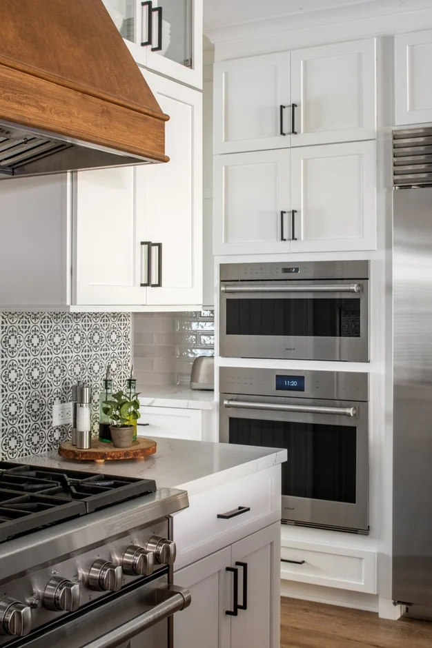 A decorative patterned tile backsplash was installed, extending from the countertop to the ceiling behind the range. This feature adds visual depth and ties together the modern and classic design elements.