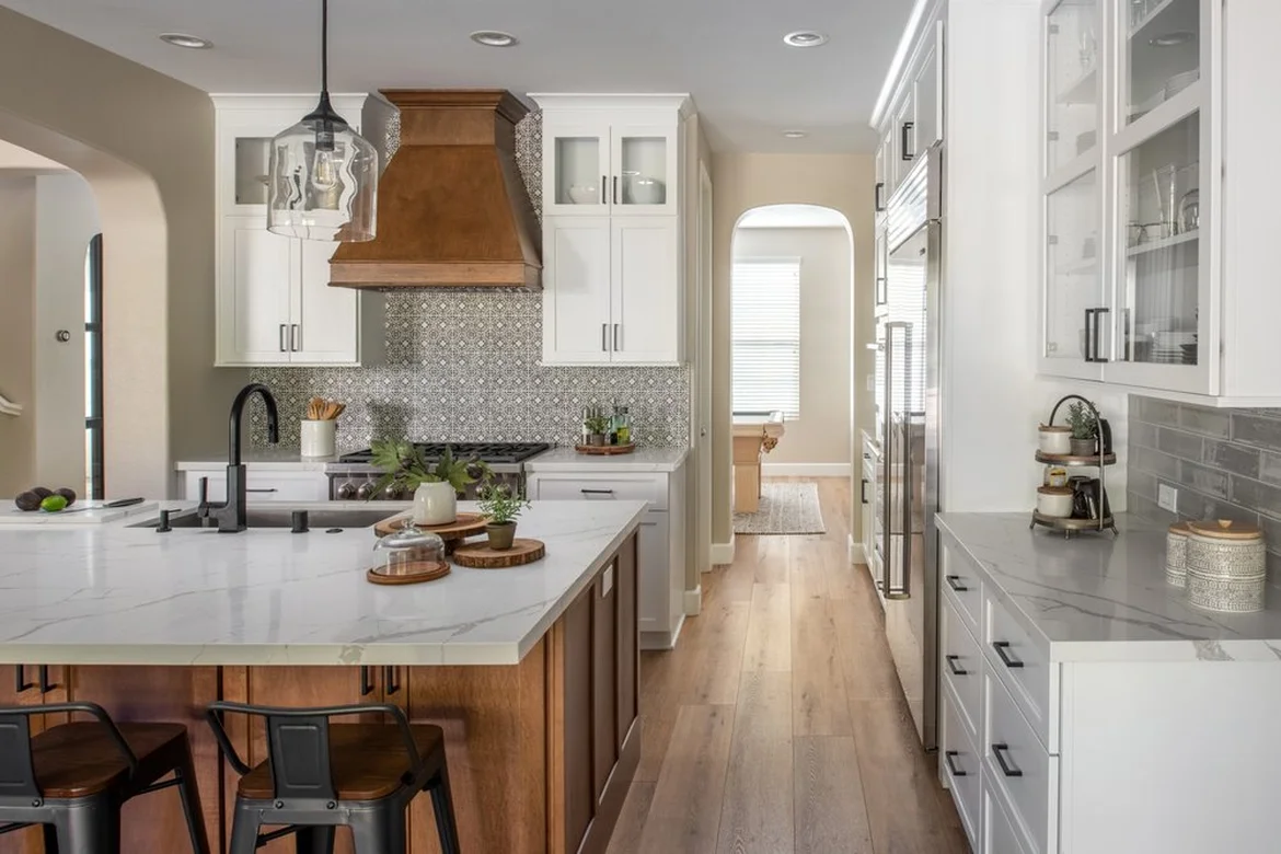A custom wood range hood was installed as a focal point of the kitchen. Its warm natural tone adds contrast to the white cabinetry and highlights the architectural character of the space.