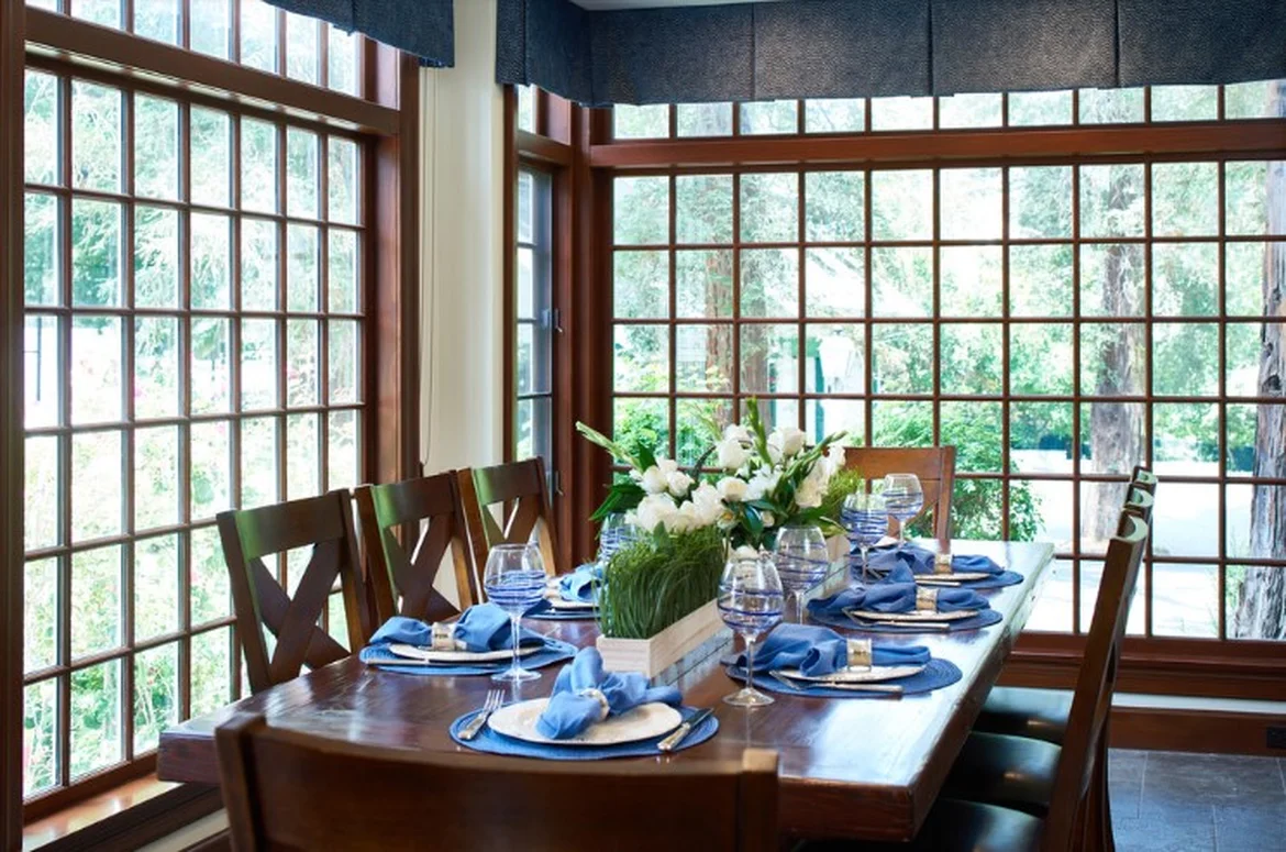 Created a cohesive dining area with a long wooden table and comfortable seating