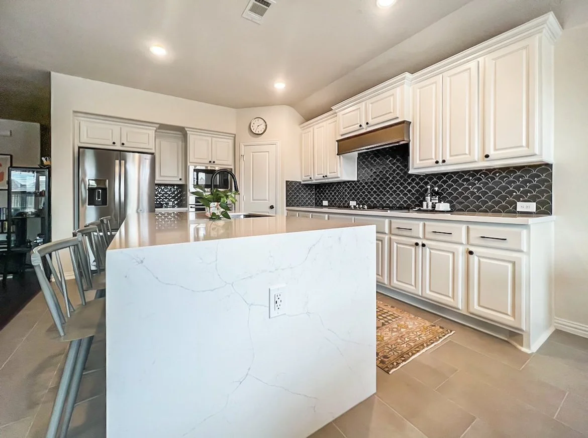 All existing countertops were removed and replaced with light quartz surfaces featuring subtle veining. The island was upgraded with a waterfall-edge quartz design, adding a luxurious, sculptural element that enhances both the kitchen’s durability and visual appeal.