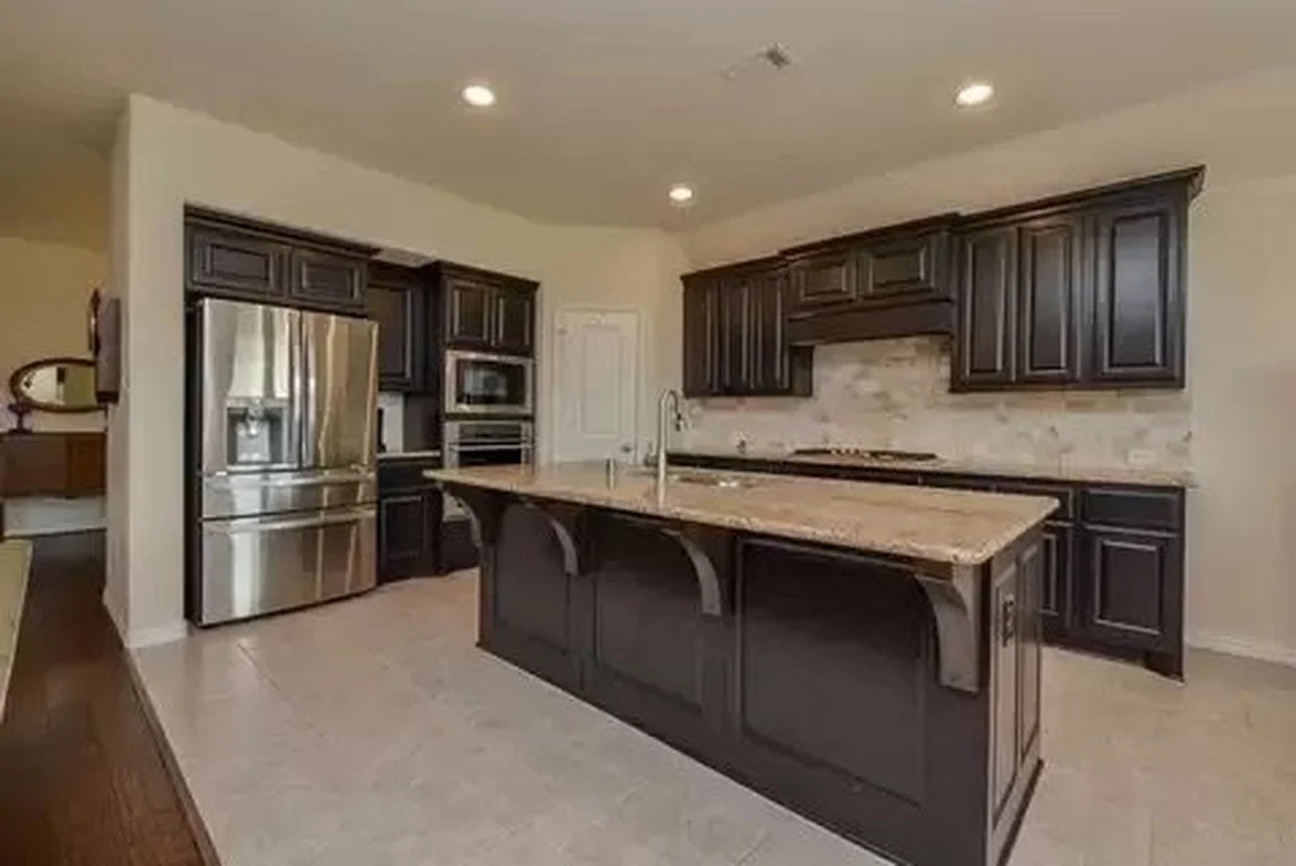 The original dark brown cabinets were completely refinished, primed, and painted. Upper and lower wall cabinets were transformed into a crisp white finish, while the island received a contrasting matte black color. New modern hardware was installed to complete the updated look and improve everyday usability.