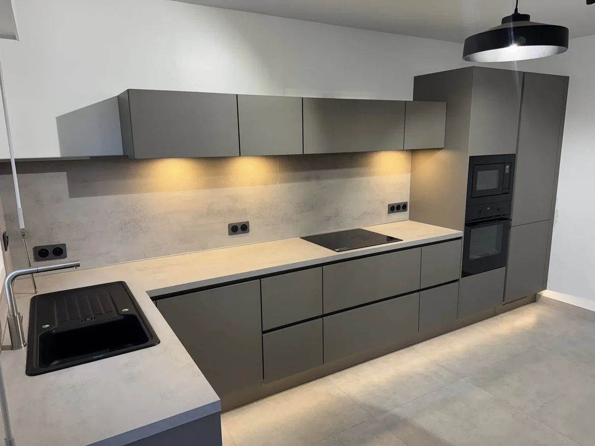 This kitchen renovation achieves a clean, minimalist aesthetic with refined grey cabinetry, warm lighting, and sleek, durable finishes. The result is a modern and highly functional cooking space with an elevated, architectural look.