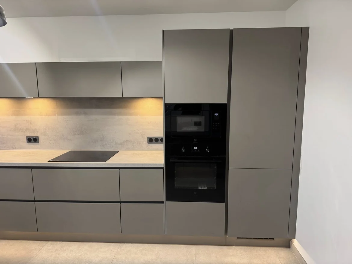 Installed full-height matte cabinets with handleless fronts, creating a seamless and contemporary visual flow throughout the space. -
