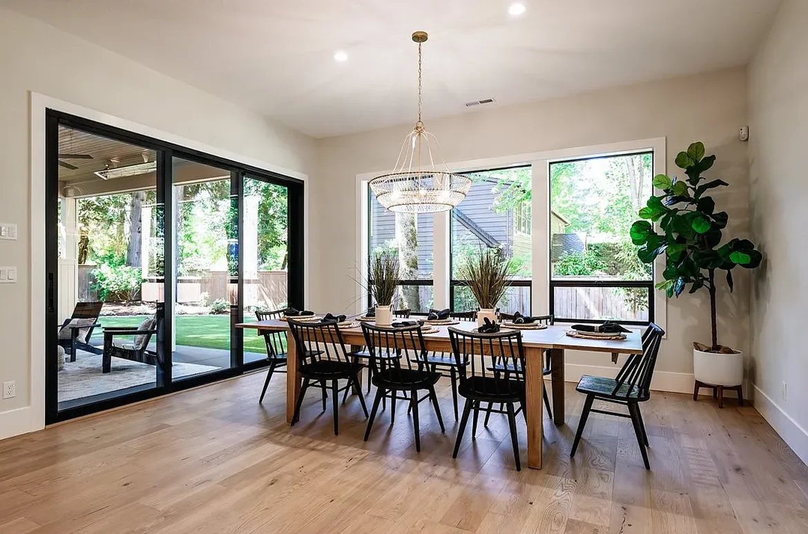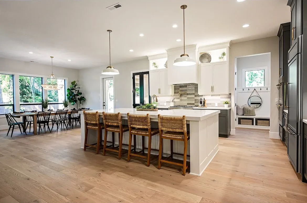 The electrical system was updated with new wiring, circuits, outlets, and switches. Recessed LED ceiling lights were installed throughout, along with pendant lighting above the island and dining table. Under-cabinet lighting was added to improve visibility and highlight the countertops.