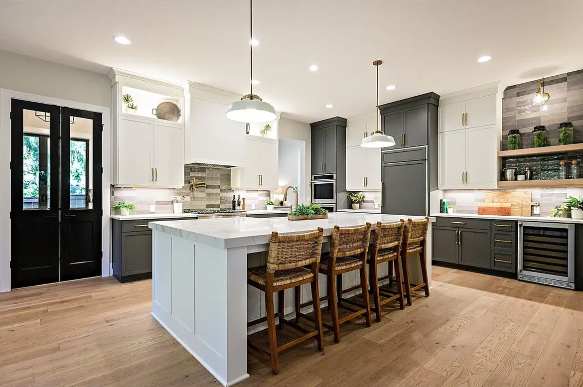 New two-tone custom cabinetry was installed, including full-height upper cabinets, deep storage drawers, soft-close hardware, and integrated refrigerator panels. Additional built-in features include open wood shelving, a pantry wall, and a custom mudroom bench with cubbies and wall hooks.