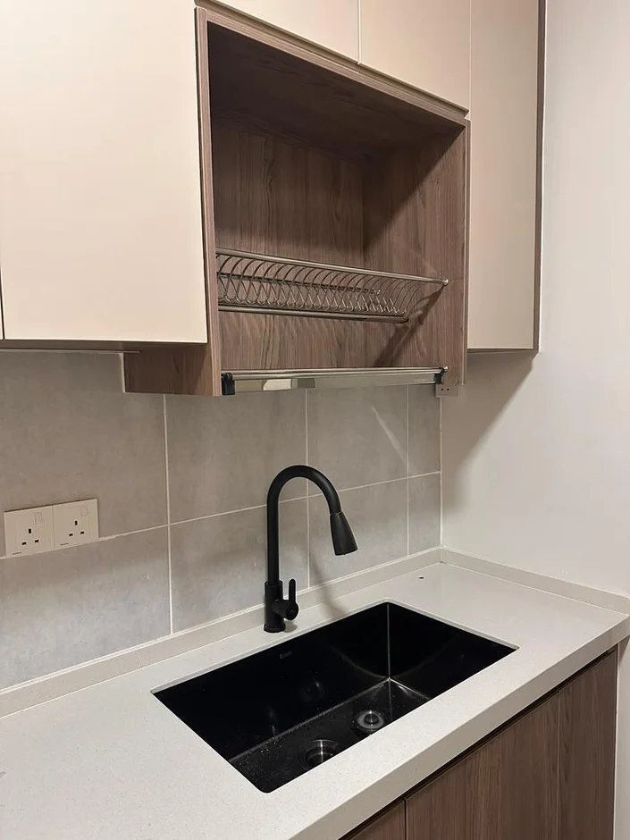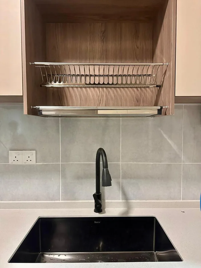 Added a built-in pull-down dish rack directly above the sink for convenient everyday use. This space-efficient solution keeps countertops clear and enhances kitchen workflow. -