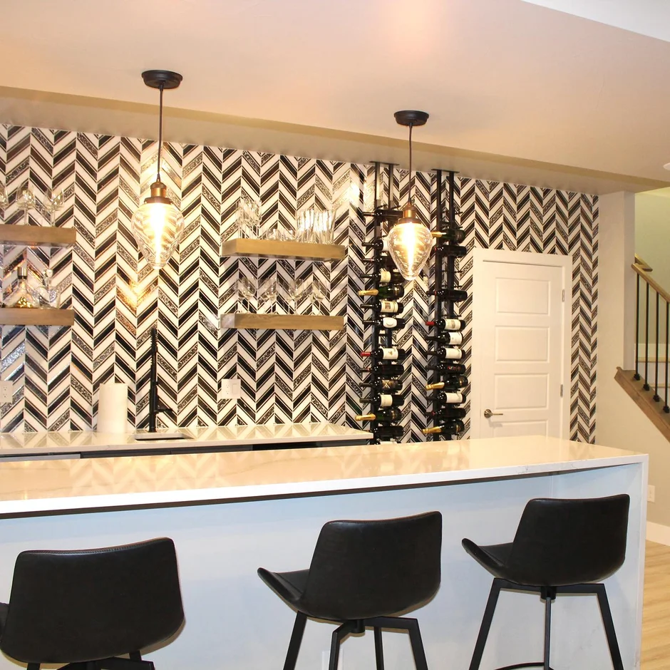 The main bar wall was fully tiled with decorative geometric-pattern tile. The installation included precise layout, cutting, alignment, grouting, and edge finishing for a clean and durable result.