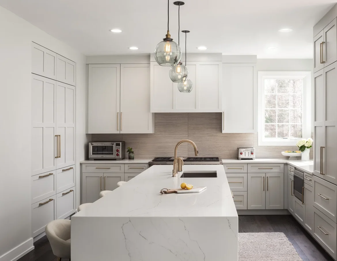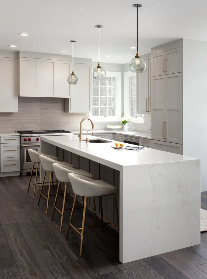 New marble-veined quartz countertops were installed throughout the kitchen, highlighted by a large waterfall-edge island. The island provides expanded workspace, seating, and serves as the central focal point of the kitchen.