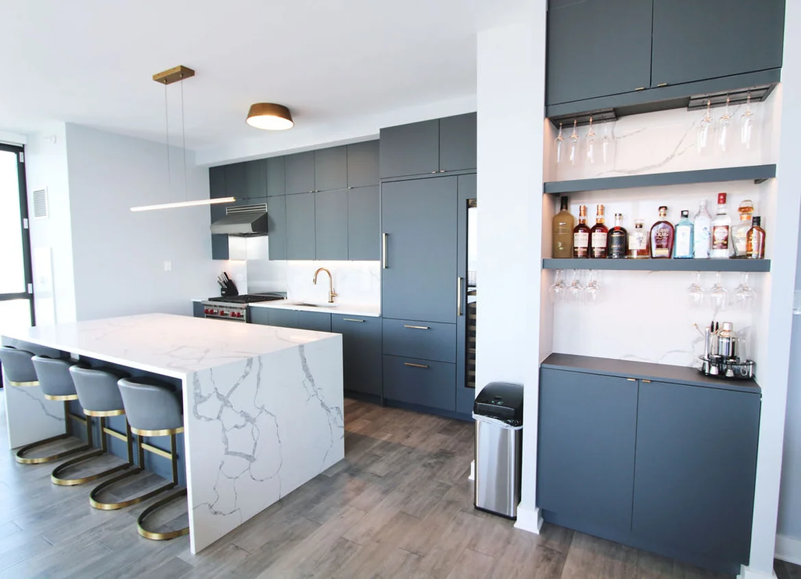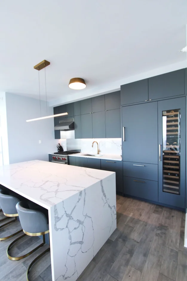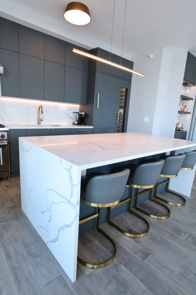 Marble-look quartz countertops were installed throughout the kitchen, including a waterfall-edge island. This feature provides additional workspace, seating, and a strong visual statement.
