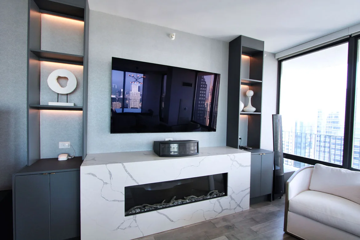 A linear electric fireplace was installed as part of a custom media wall. The setup includes a wall-mounted TV, integrated cabinetry, and open shelving, creating a functional and visually balanced focal point in the living area.