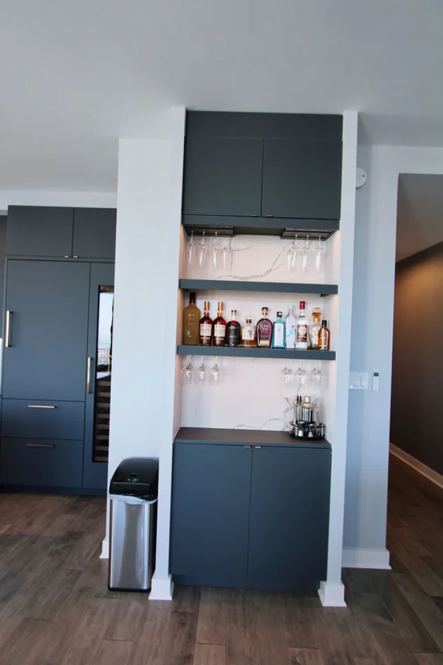 A dedicated bar area was constructed with custom base cabinets and open display shelving. The design offers practical storage for glassware and beverages while serving as a stylish focal feature.