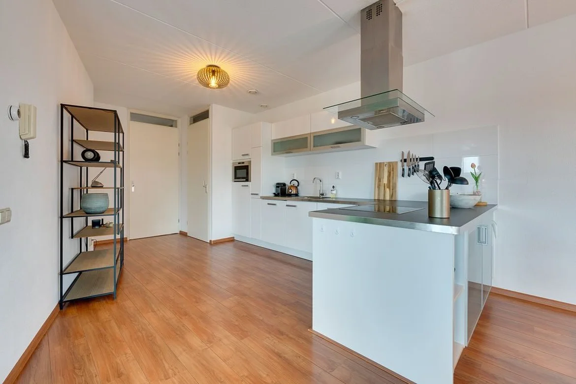 Installed warm-toned wood flooring throughout the kitchen area, adding contrast and comfort to the minimalist white palette. -