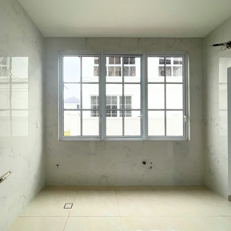 Installed a farmhouse sink paired with a sleek chrome faucet, set into marble countertops framing a large window for a bright, airy washing zone. -