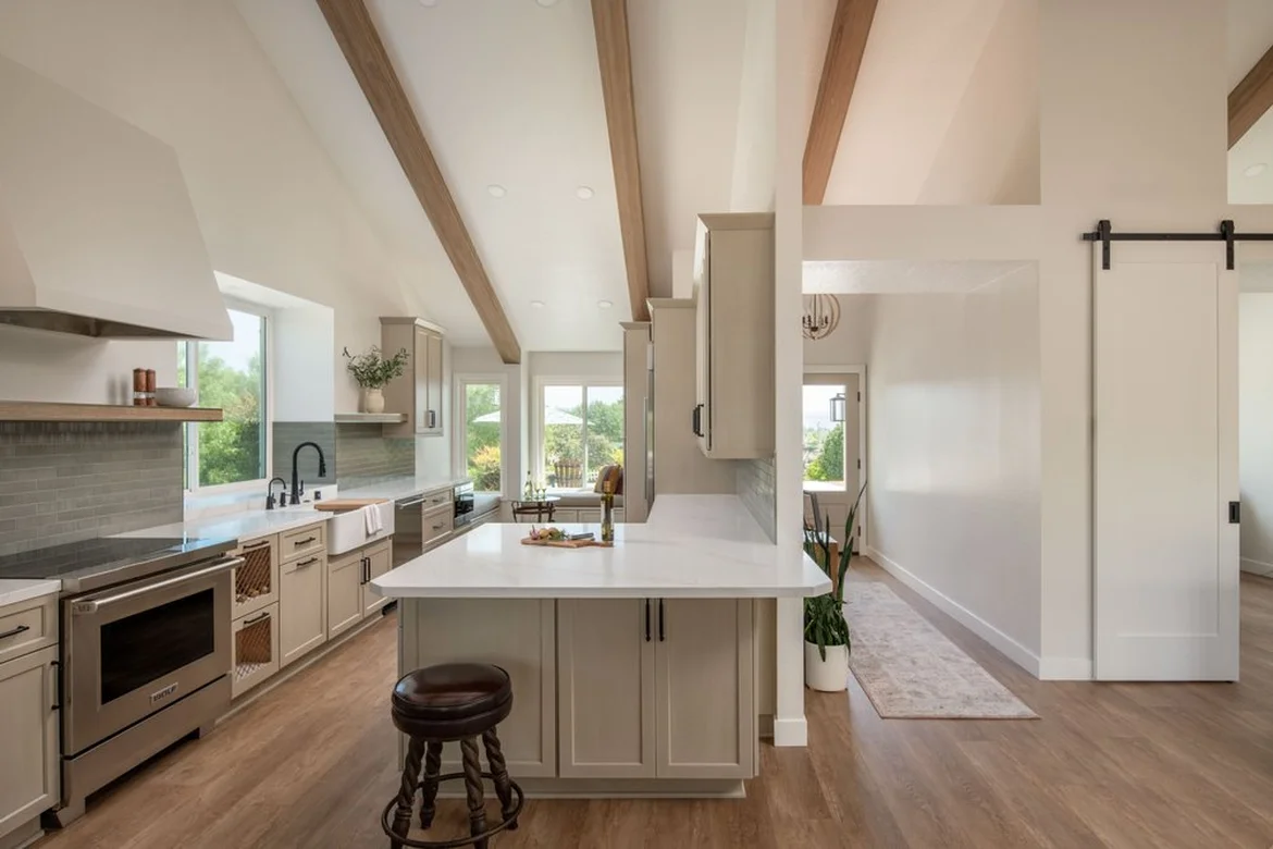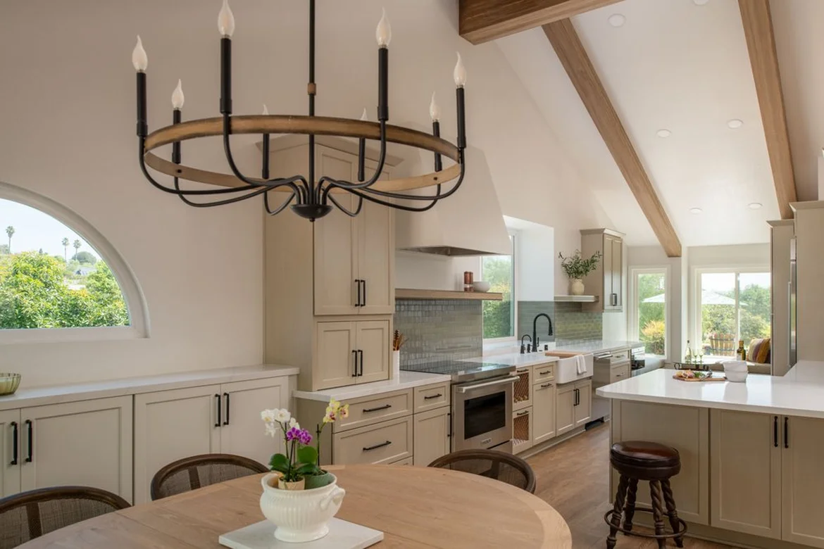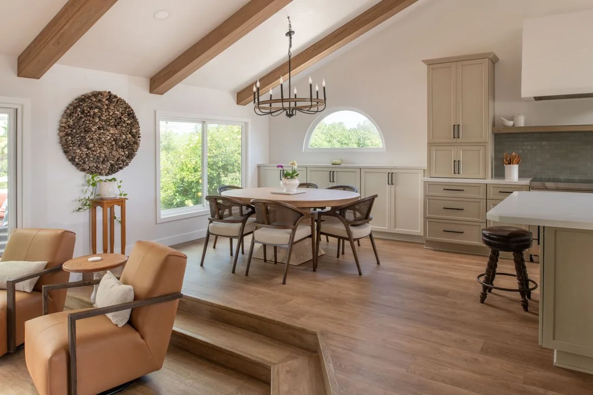 Decorative wood ceiling beams were added to emphasize the vaulted ceiling and add character to the open space. These elements bring warmth and architectural depth to the overall design.