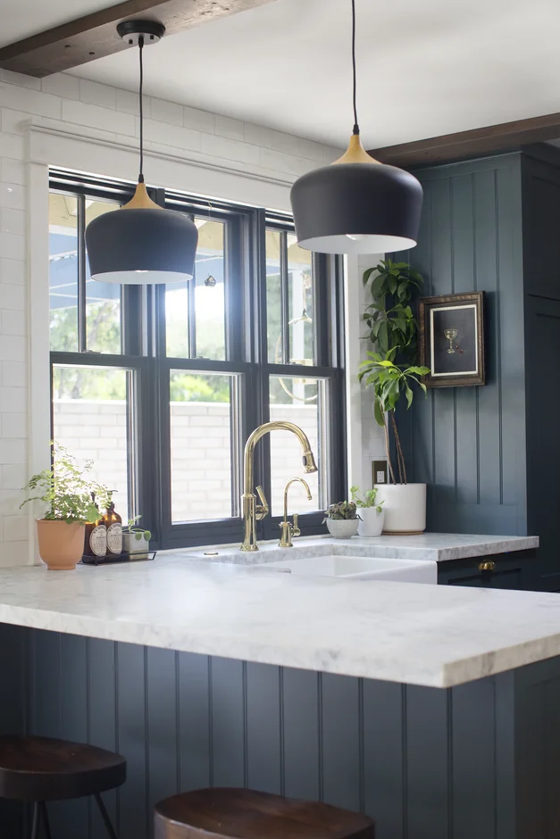 New brass wall sconces and updated electrical placements create a well-lit, balanced environment suitable for cooking and gathering. -