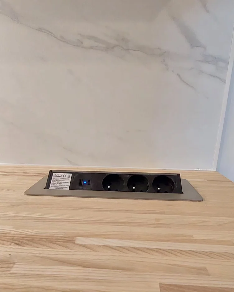 Installed built-in countertop power outlets for convenient access while maintaining a clean, clutter-free workspace. -