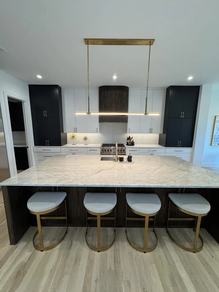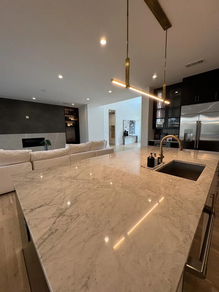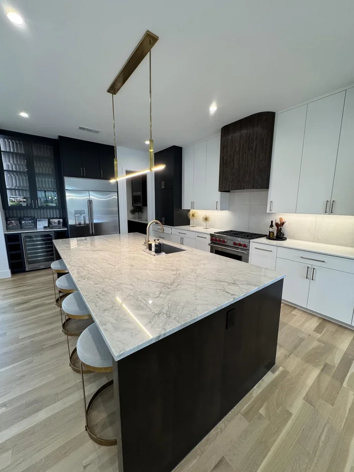 Installed an oversized kitchen island with a marble-look quartz countertop, providing a durable, high-end work surface that doubles as a central entertaining zone. -