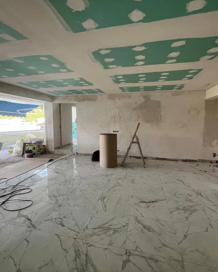 Installed polished marble-effect flooring to maximize natural light reflection and elevate the overall atmosphere with a luxurious yet modern finish. -