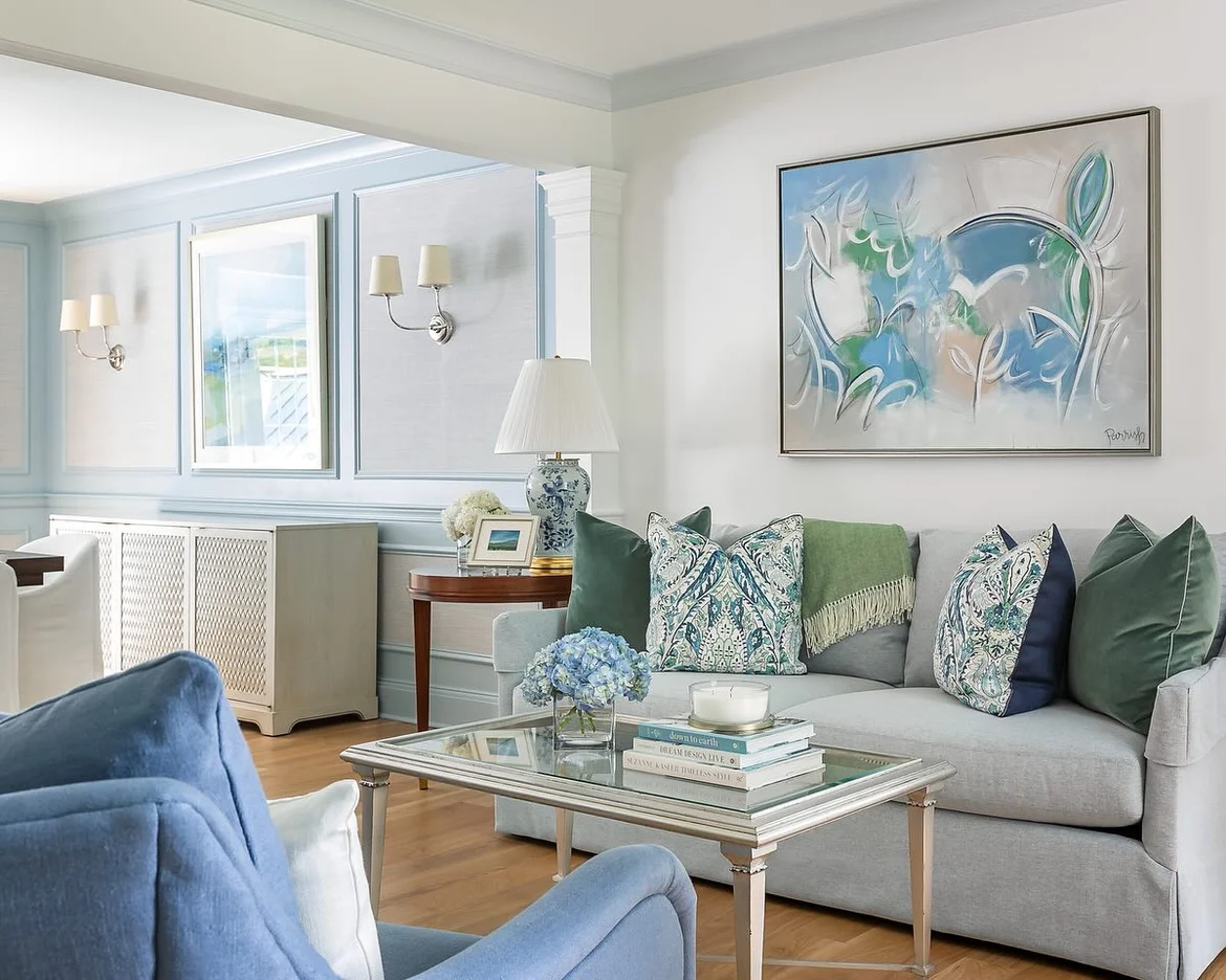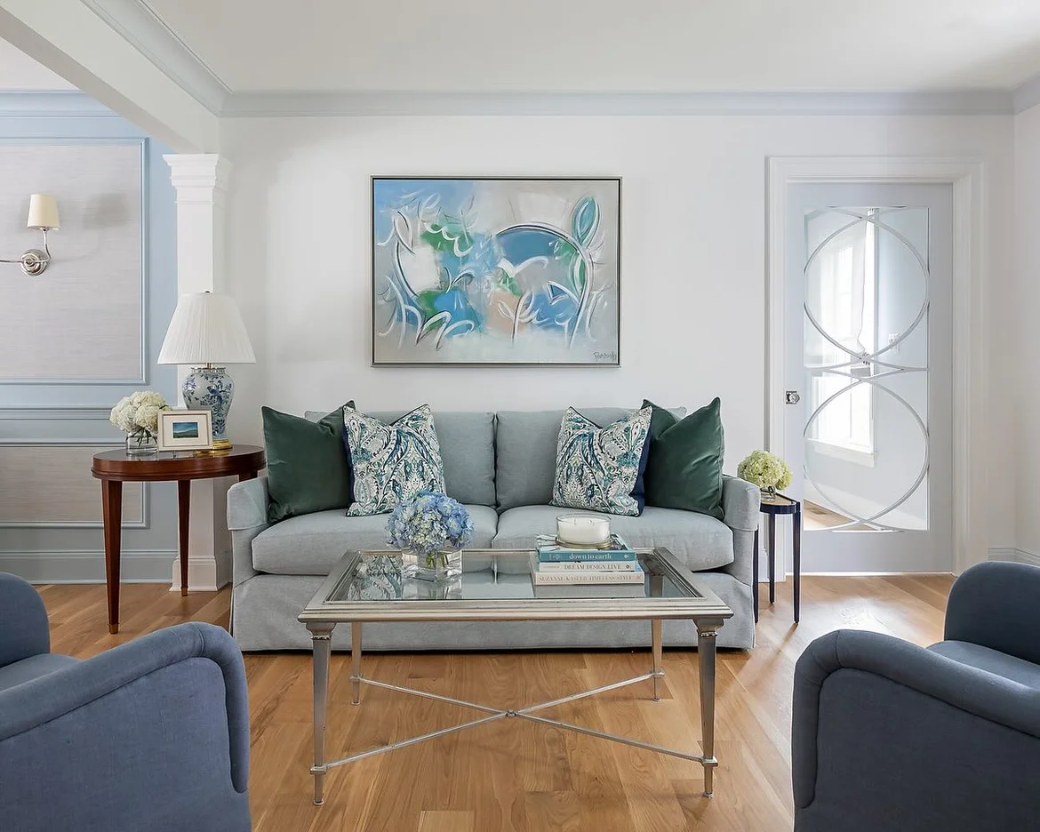 Applied a soft mix of light neutrals, muted blues, and subtle green accents to create a calm and cohesive visual atmosphere throughout the room. -
