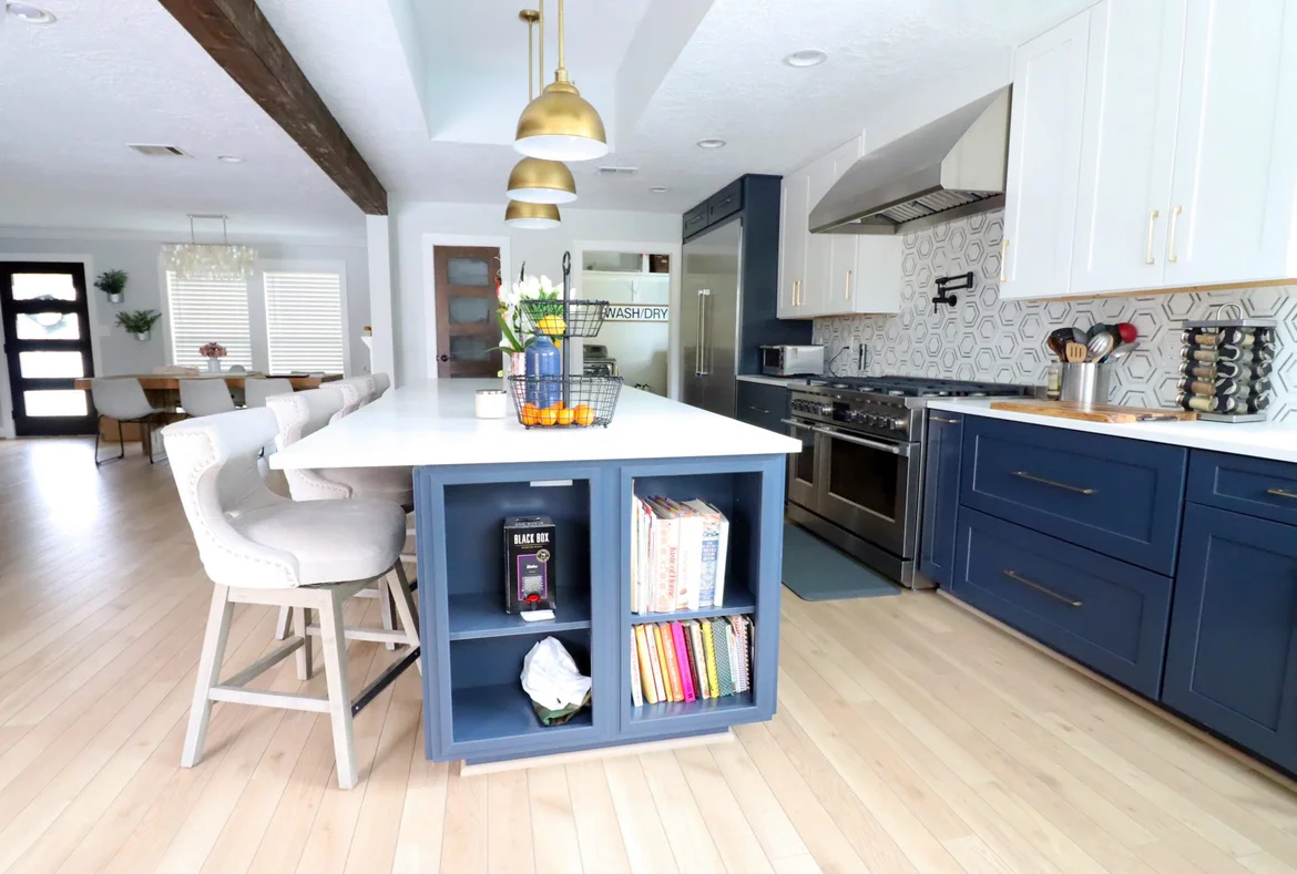 The lighting layout was completely updated with new recessed ceiling lights and elegant brass pendant fixtures above the island. These additions improve illumination and create a warm, inviting atmosphere.