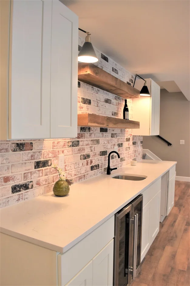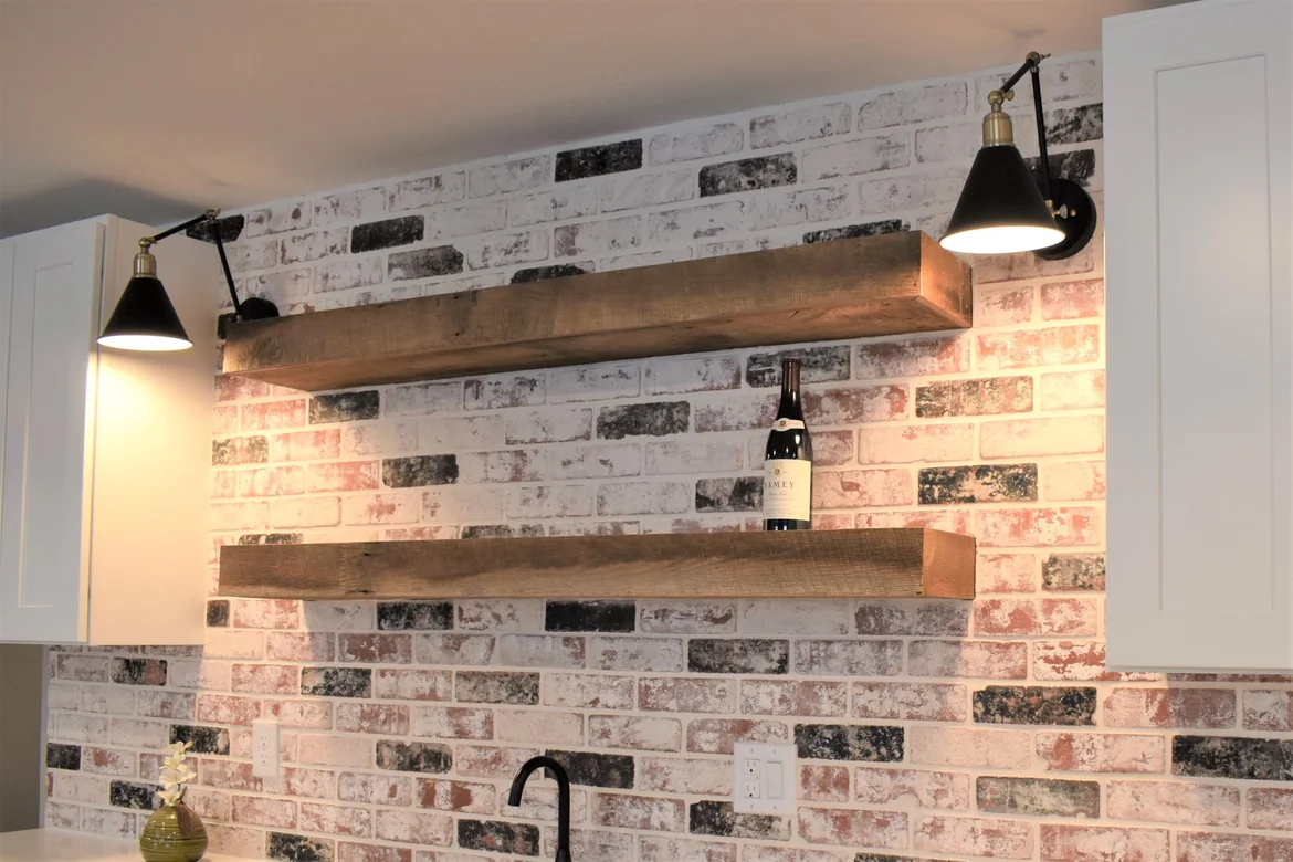 A brick-style tile backsplash was installed on the kitchenette wall. Floating wooden shelves were securely mounted above the countertop to provide functional storage and structural support.