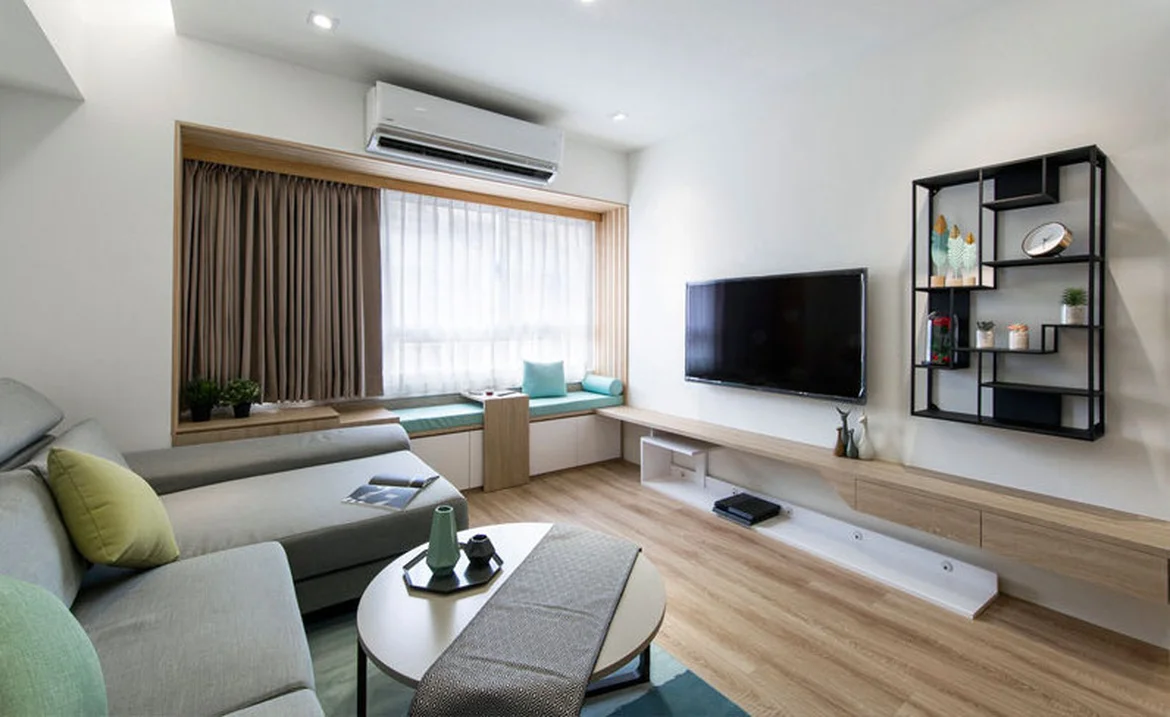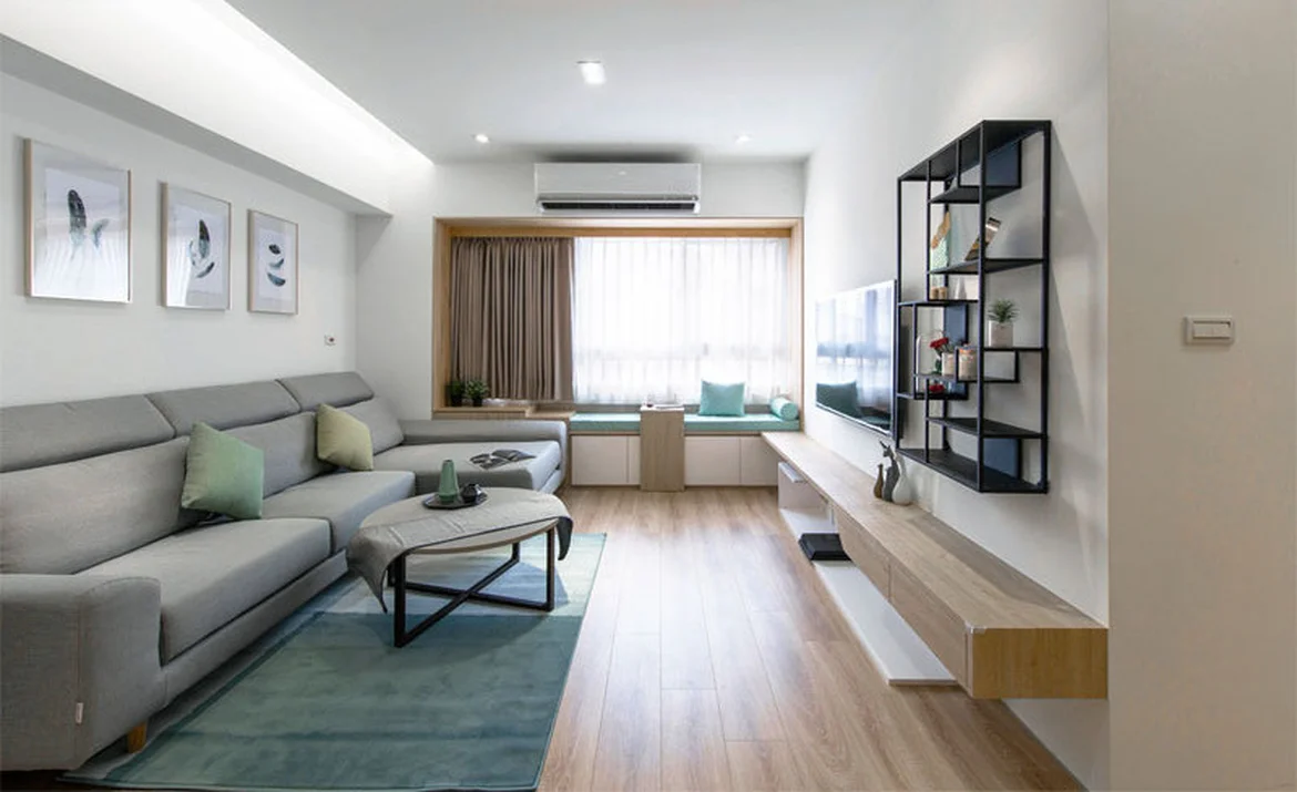 Custom-built storage units, shelving, and a floating media wall were installed using wood-finish panels. These tailored solutions maximize storage capacity while preserving a clean, minimalist appearance.