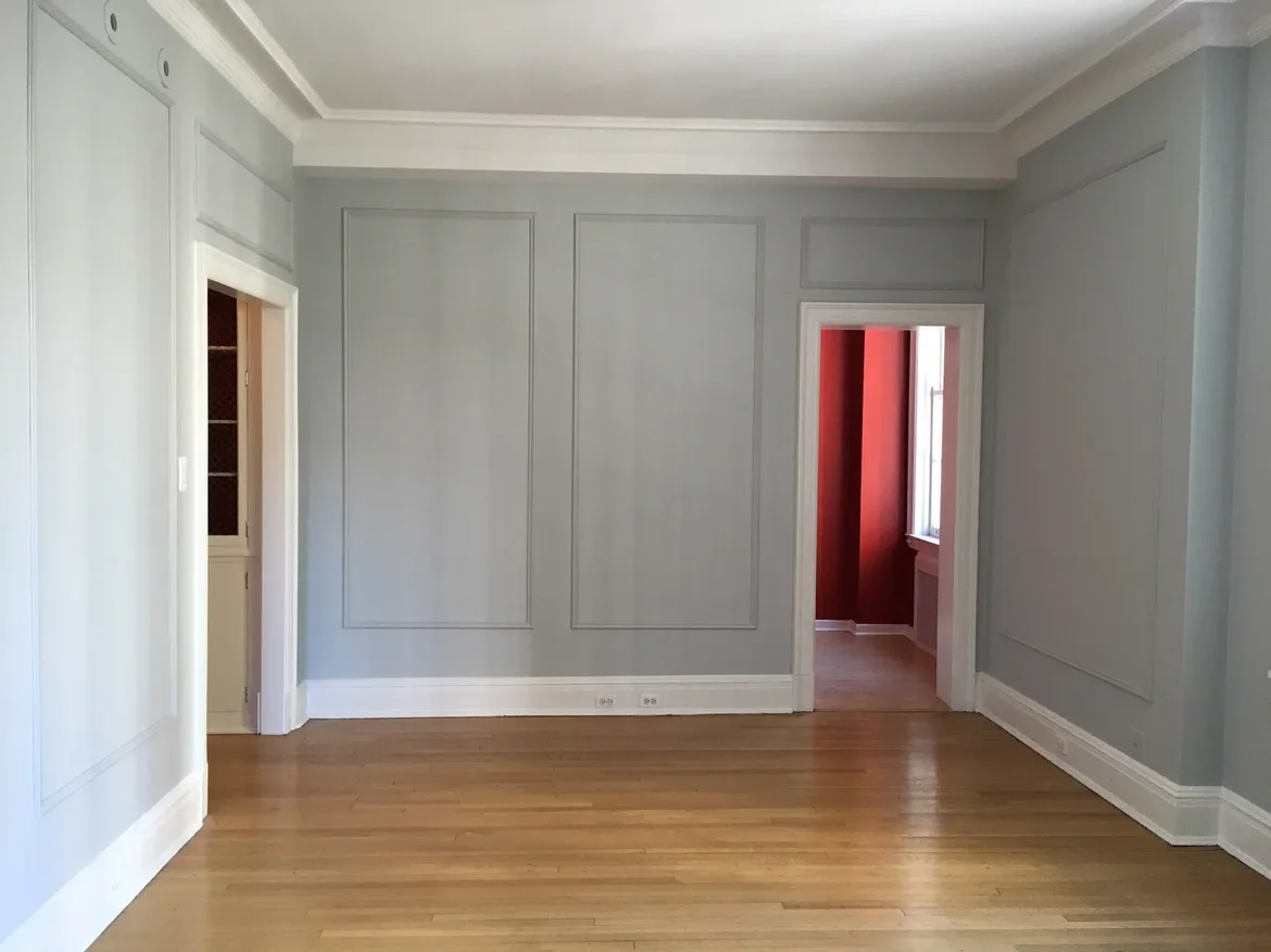 The ceiling was fully resurfaced, repainted, and upgraded with a detailed decorative ceiling medallion. Updated lighting fixtures were added to improve illumination and complement the room’s modern aesthetic.