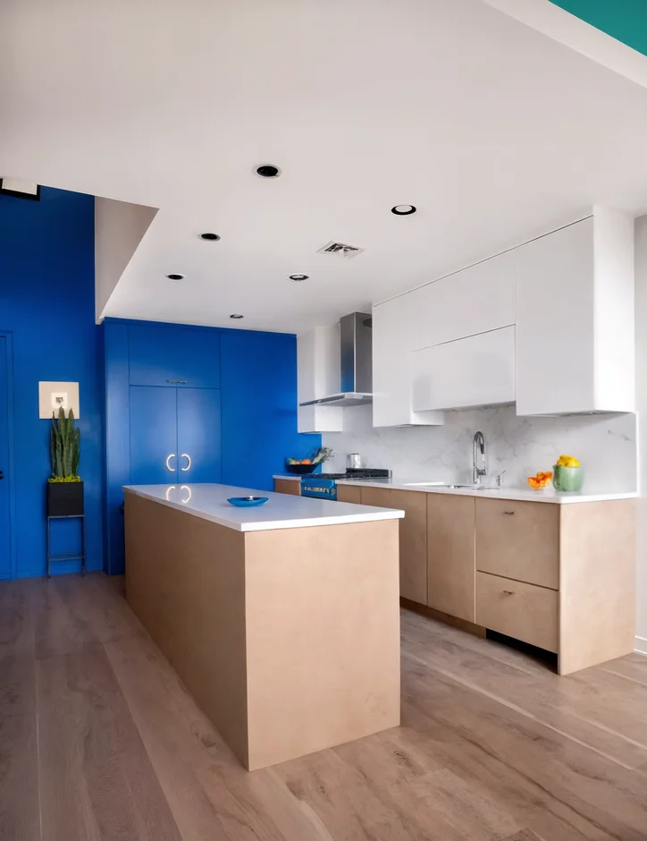 This vibrant condo remodel was created for a passionate art collector who wanted their home to feel like a living gallery. Bold, saturated colors — electric blue, hot pink, lime green, and bright yellow — were used confidently across walls, ceilings, and cabinetry to energize the space and provide dramatic backdrops for artwork and sculptural pieces.