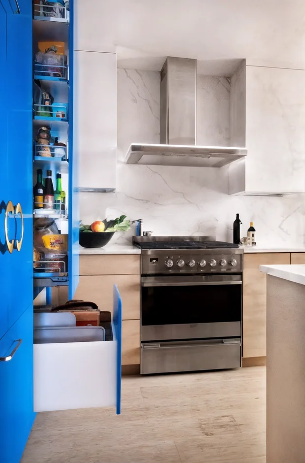 Electric blue kitchen cabinetry paired with light wood island, white uppers, marble-look counters, and a striking gold geometric chandelier.
