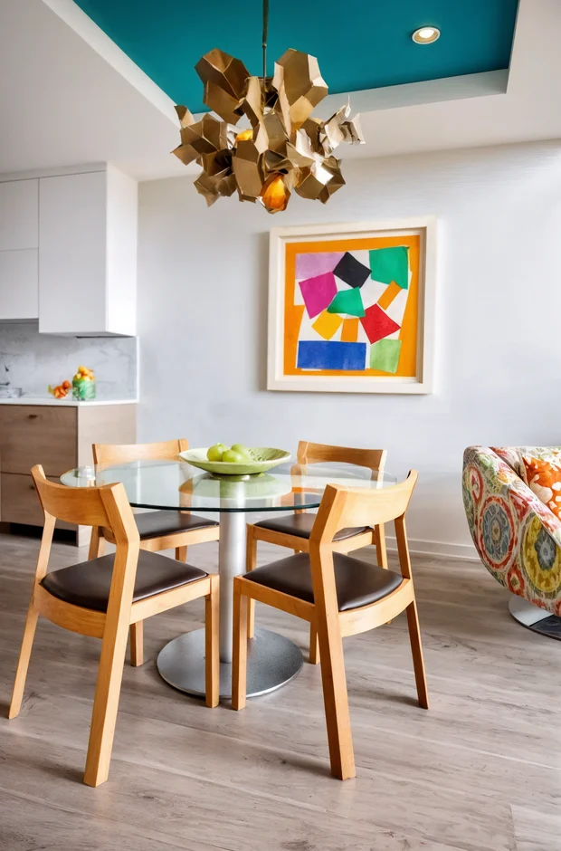 Dining area with teal tray ceiling, vibrant abstract artwork, and mid-century chairs around a glass table.