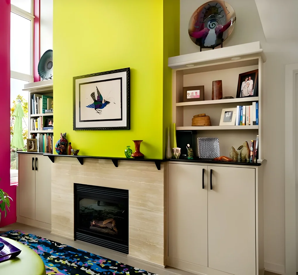 Bright lime-green accent wall framing a stone fireplace, flanked by built-in shelving filled with books, ceramics, and sculptures.