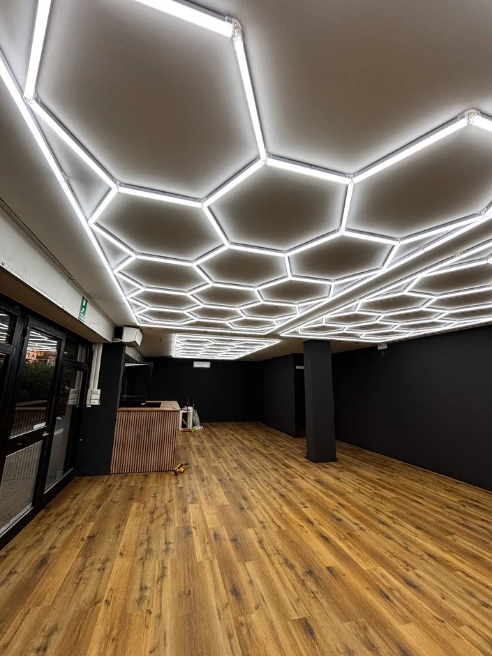 Installed a bespoke ceiling lighting system featuring hexagonal LED elements, providing uniform illumination while creating a distinctive architectural focal point. -