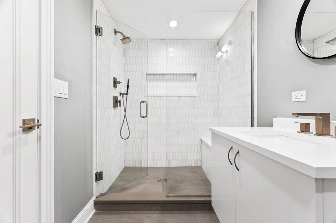 The new walk-in shower was built from the studs out—framing, cement board installation, shower pan construction, and full waterproof membrane application. After testing the waterproofing, the shower was tiled with elongated geometric marble tile. A built-in bench and recessed shelving were integrated, and modern fixtures including a handheld wand and shower head were installed.