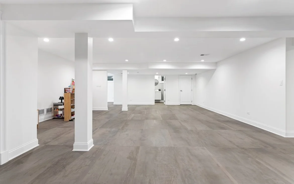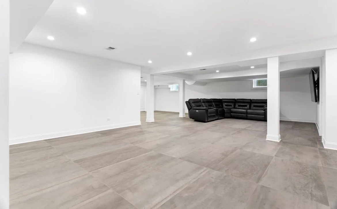 The concrete subfloor was leveled, patched, and treated with bonding agent before tile installation. Large ceramic tiles were installed throughout the basement, providing a durable, moisture-resistant, and easy-to-maintain flooring solution.