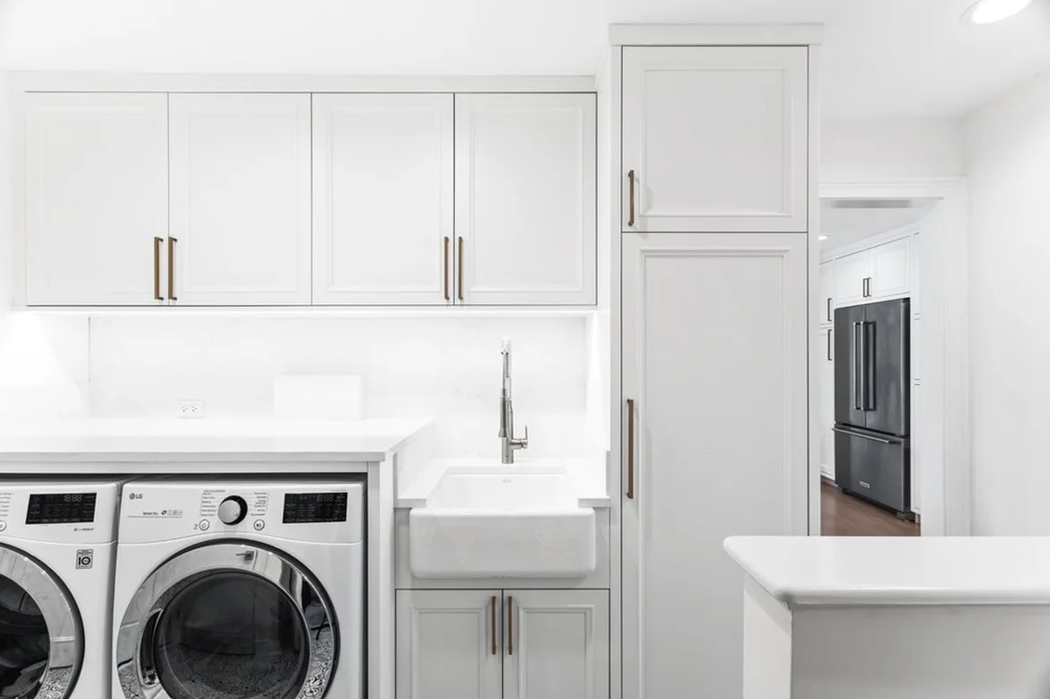 The laundry zone was built from scratch with new plumbing connections, drain lines, and dryer venting. Custom upper cabinets and a pantry unit were added for extra storage. A built-in enclosure was constructed around the washer and dryer, supporting a new quartz countertop for convenient folding and workspace.