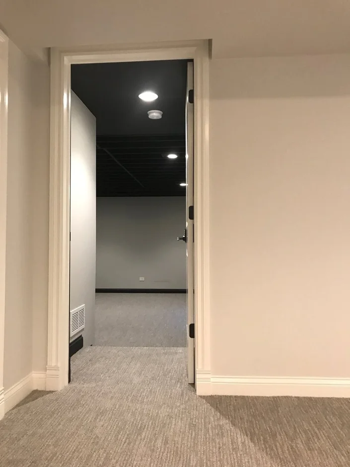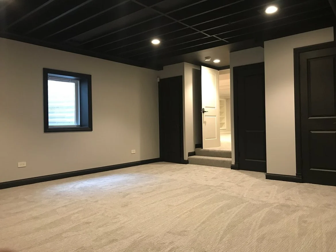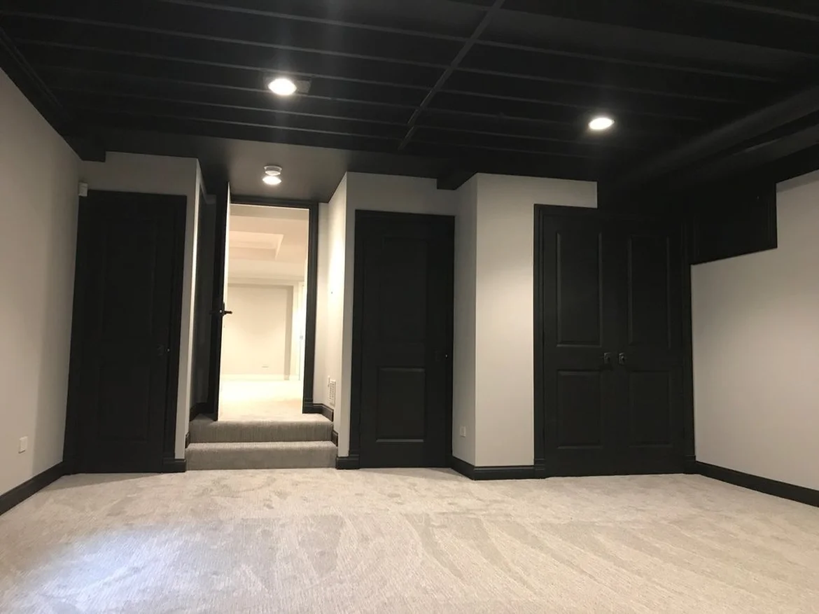 New interior doors were installed, including both white and black finishes to complement the design. Fresh baseboards and trim were added throughout the basement and painted to match the updated color palette, giving the space a polished and refined appearance.