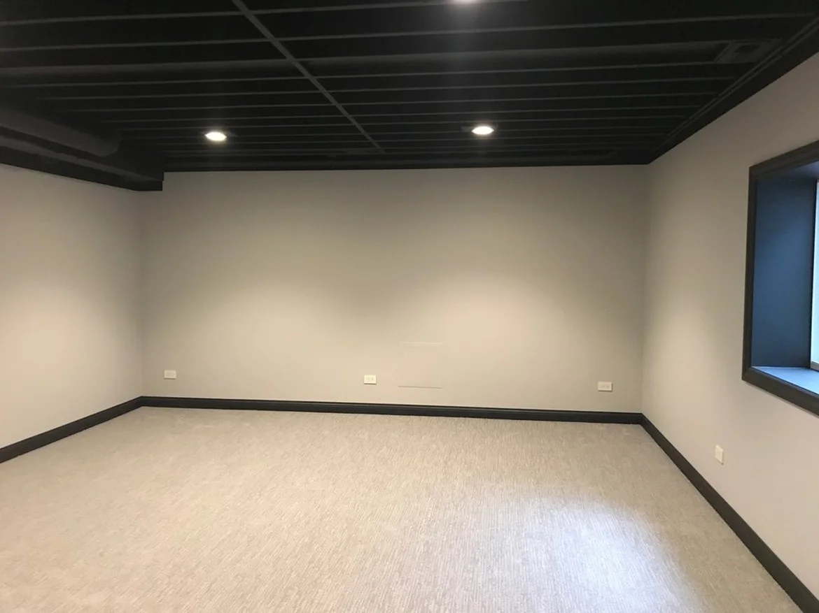 The basement ceiling underwent a full upgrade. One section received a modern open black ceiling with exposed beams, while the main area was finished with smooth drywall. New recessed LED lights were installed throughout, providing even illumination and enhancing the overall atmosphere.
