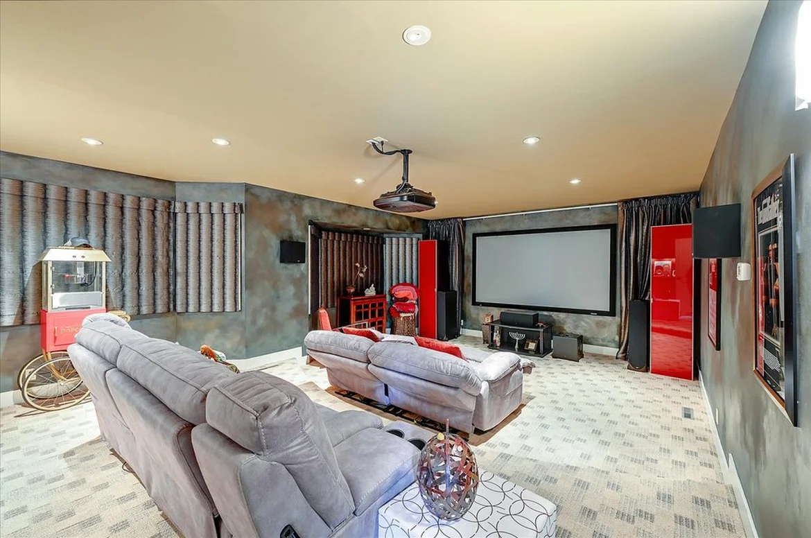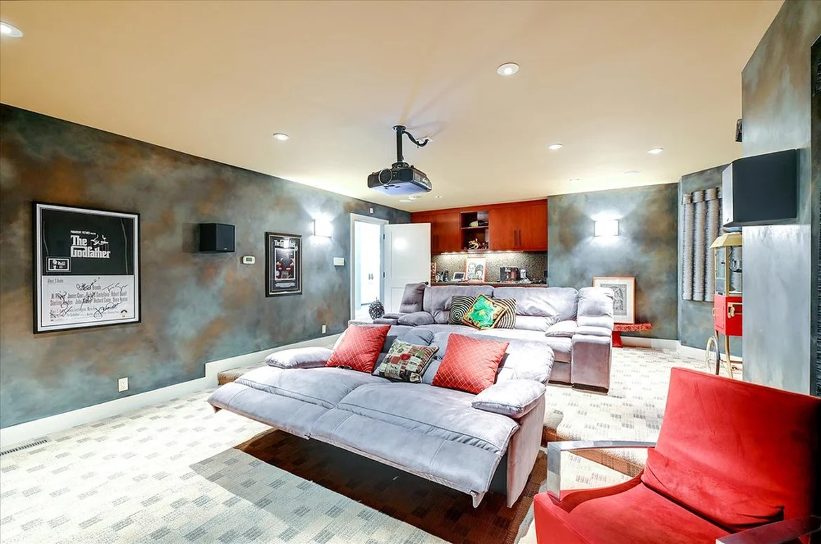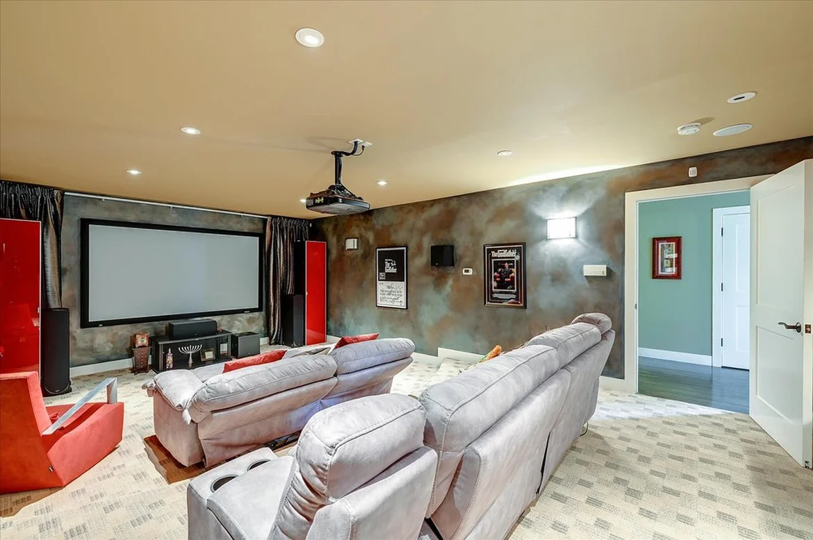 All walls were refinished with a textured, cinematic paint scheme in darker tones to enhance projector contrast. The updated finish contributes to a cozy, theater-appropriate atmosphere.
