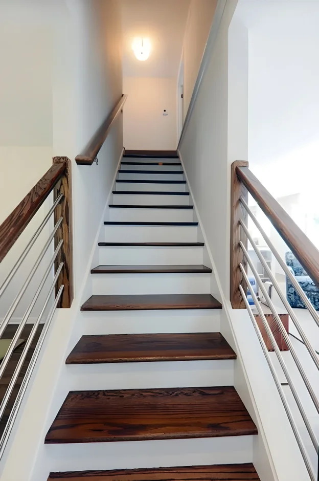 Treads and Risers: Refinished the stair treads with a deep, natural wood stain that matches the surrounding hardwood floors, and painted the risers a crisp white. This high-contrast combination grounds the structure.