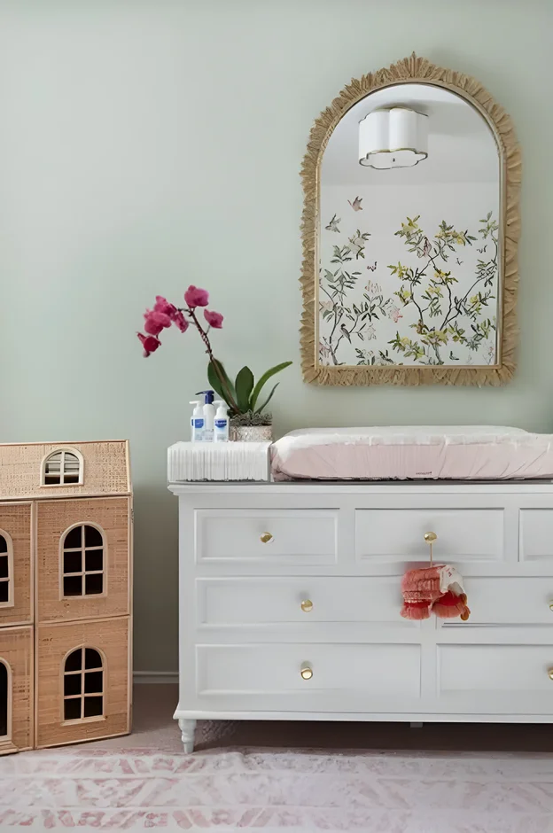 Our redesign transformed the space into a whimsical yet sophisticated nursery that balances playful elements with timeless design. We enveloped the room in a soft, soothing green, creating a serene and calming atmosphere.