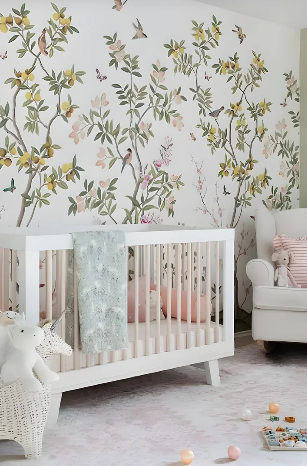 Accent wall adorned with delicate floral and bird wallpaper for visual interest.
