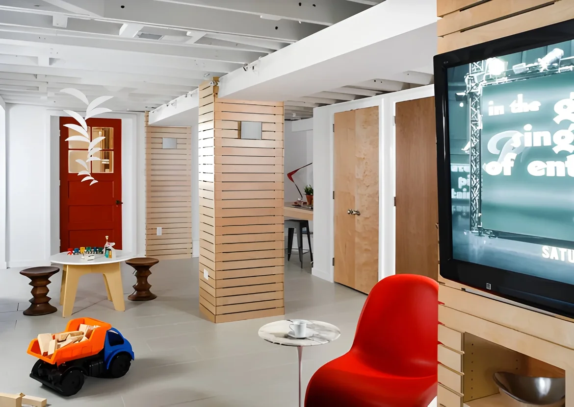 A spacious, inviting lower level that now serves as a true family hub for relaxing, playing, working, and entertaining. The open layout, natural wood elements, strategic lighting, and vibrant accents create a contemporary loft vibe that's significantly larger-feeling, brighter, and far more functional — turning wasted space into the home's favorite gathering spot.
