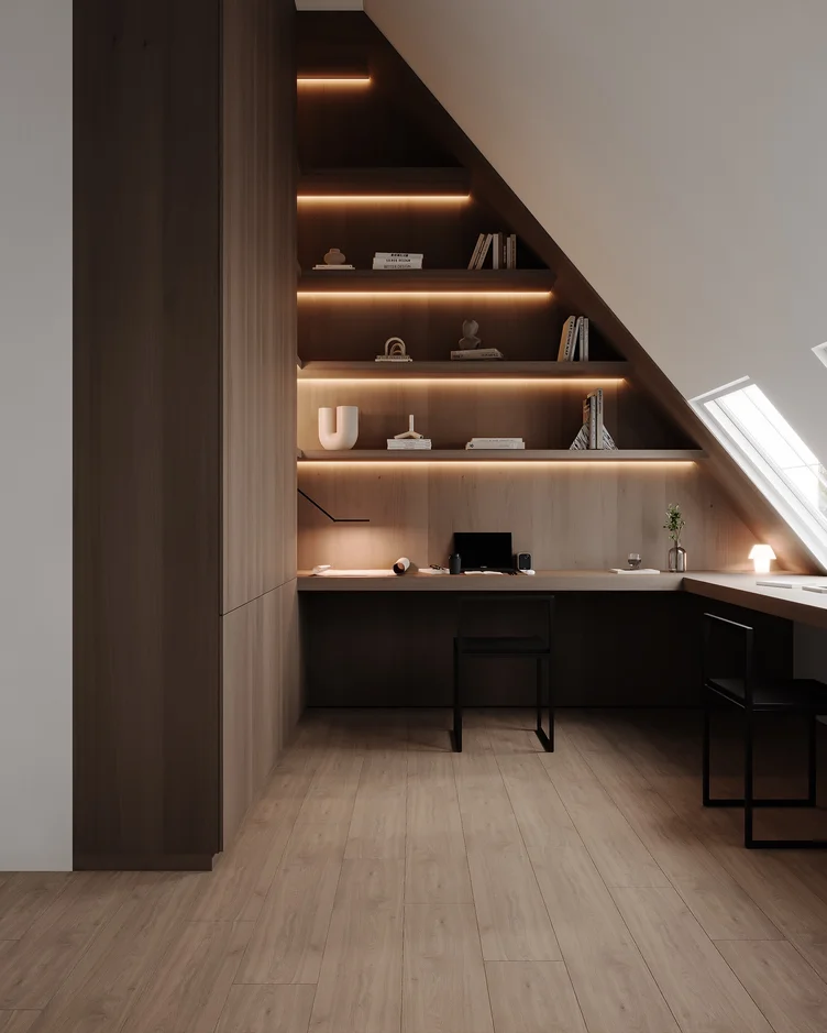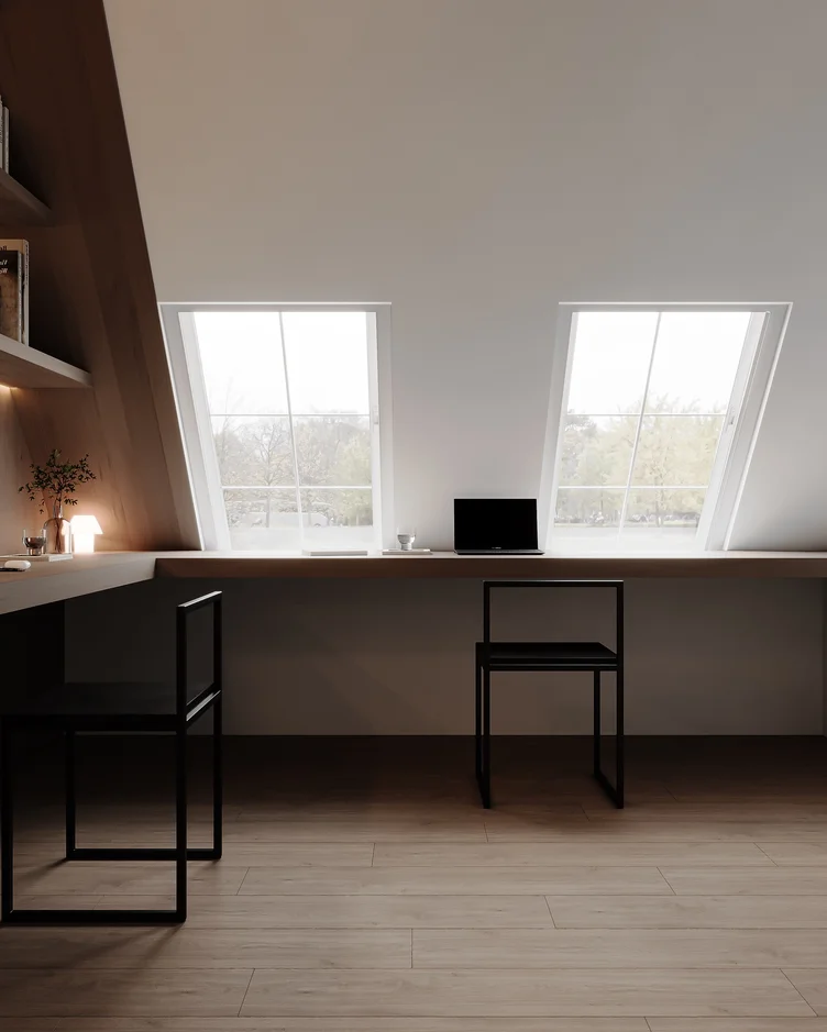 This renovation transforms an attic space into a refined, highly functional home office defined by clean lines, warm wood textures, and a serene minimalist atmosphere. The design maximizes the sloped ceiling architecture while ensuring optimal workflow, natural lighting, and visual harmony through carefully integrated storage and bespoke built-ins.