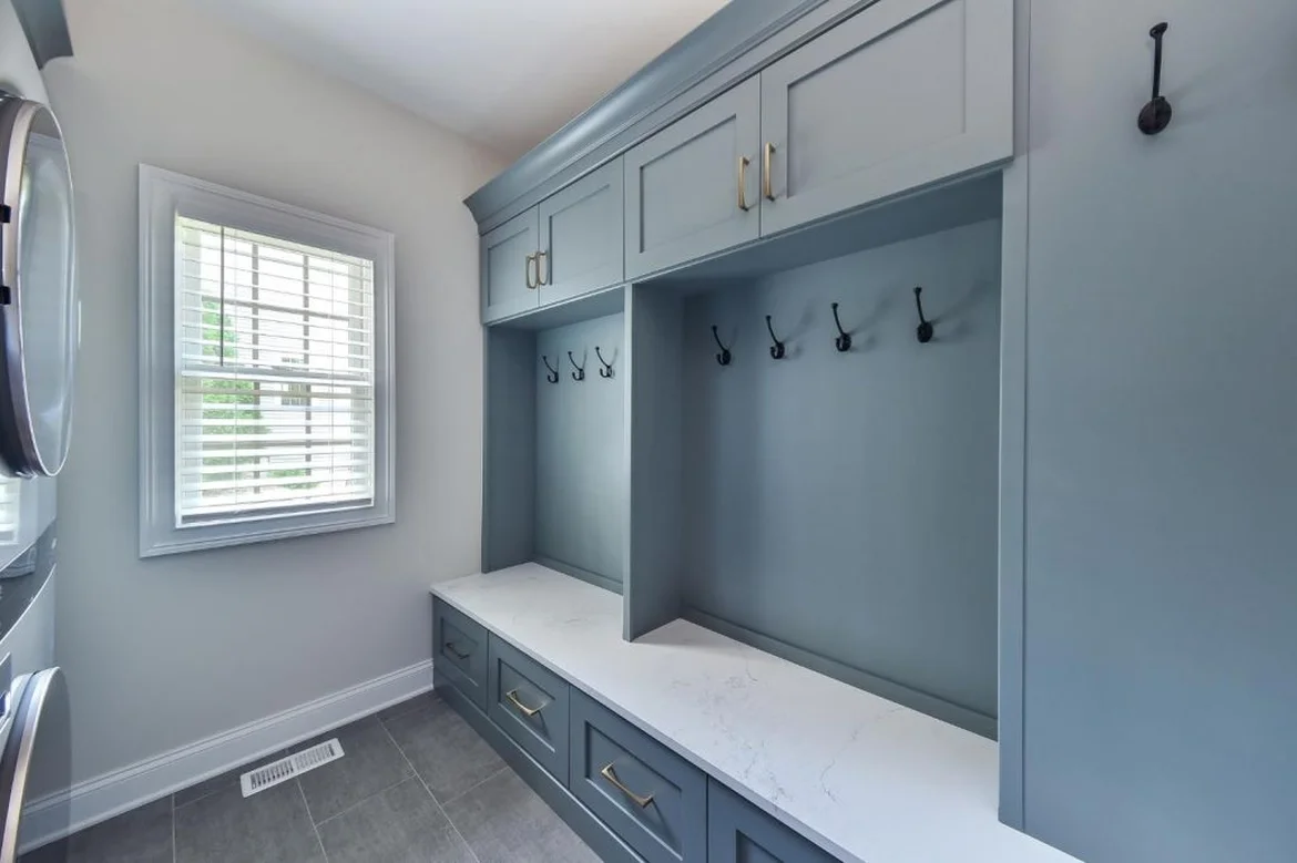 Added individual mudroom lockers with hooks, closed cabinets, and a built-in bench