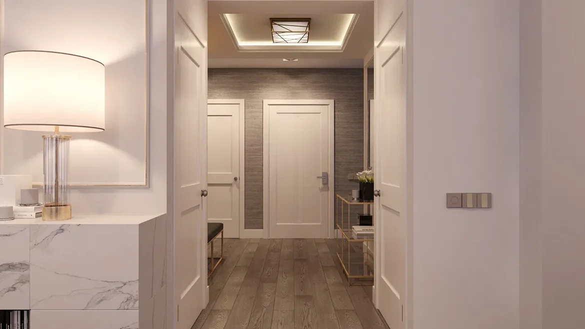 This entry and hallway renovation transforms a simple pass-through into a composed, elegant introduction to the apartment. Clean geometry, warm finishes, and layered lighting create a space that feels calm, intentional, and quietly refined.